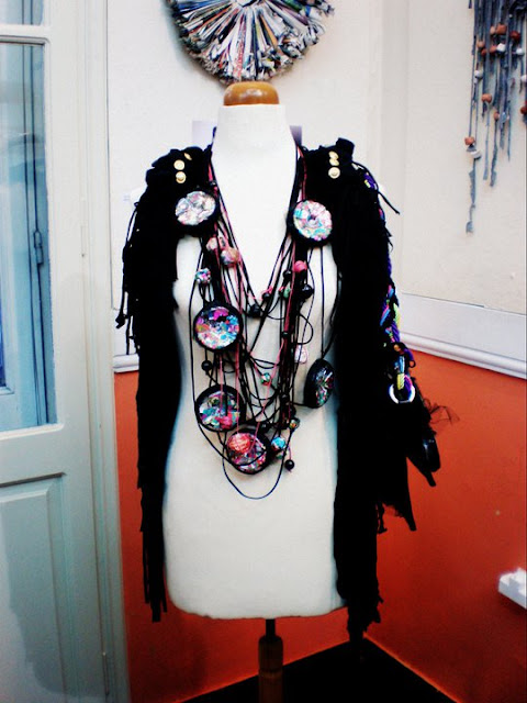 Εδω φαινεται ενα γιλεκο που εχει φτιαξει απο κροσια, ενα κολιε και μια τσαντα